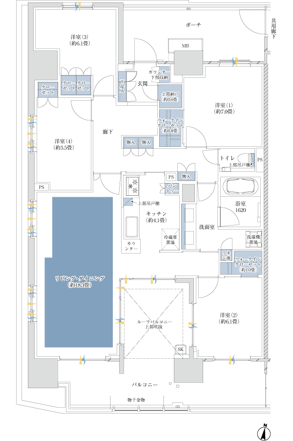- 三面採光の明るく伸びやかなリビング・ダイニングは、約18.3畳のゆとりの広さを確保。